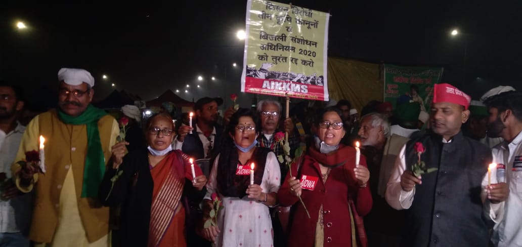 Today, Feb 14 - National Call for Candle March given by SKM. AIKS Bulandshahar district secretary Jagbirsingh Bhatti, AIDWA general secretary Mariam Dhawale, treasurer S Punyavathi, joint secretary Asha Sharma and AIKS leaders from UP and Uttarakhand took part in the Candle March at the Ghazipur border.